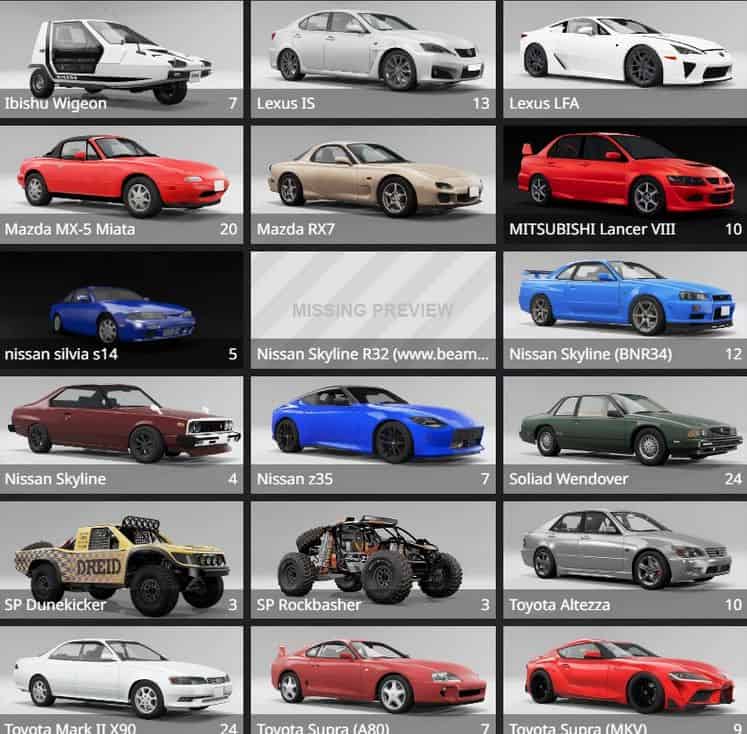 Package adds 13 JDM cars for BeamNG.drive. Most of them are good quality. I wanted to keep the back end under 2gb so it only has 13 cars but they are good.