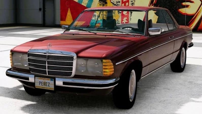 A retro Mercedes Benz W123 car in the body of a sedan, coupe and station wagon.